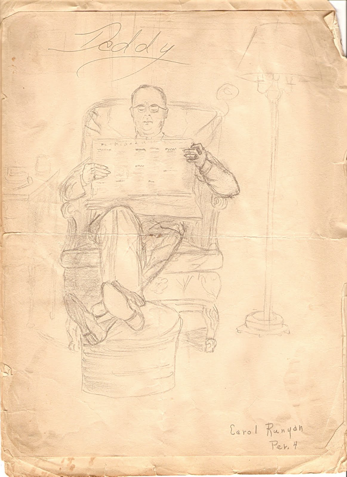 | One of my mother’s earliest sketches, “Daddy” from her high school art class |